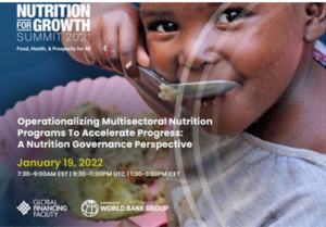The webinar will share lessons learned from multisectoral nutrition implementation experiences as seen through a nutrition governance lens from several countries supported by the World Bank and GFF. Lessons center around three pillars of 1) advocacy, leadership, and institutional support for multisectoral nutrition; 2) management capacity and financing; and 3) results measurement, monitoring and accountability.